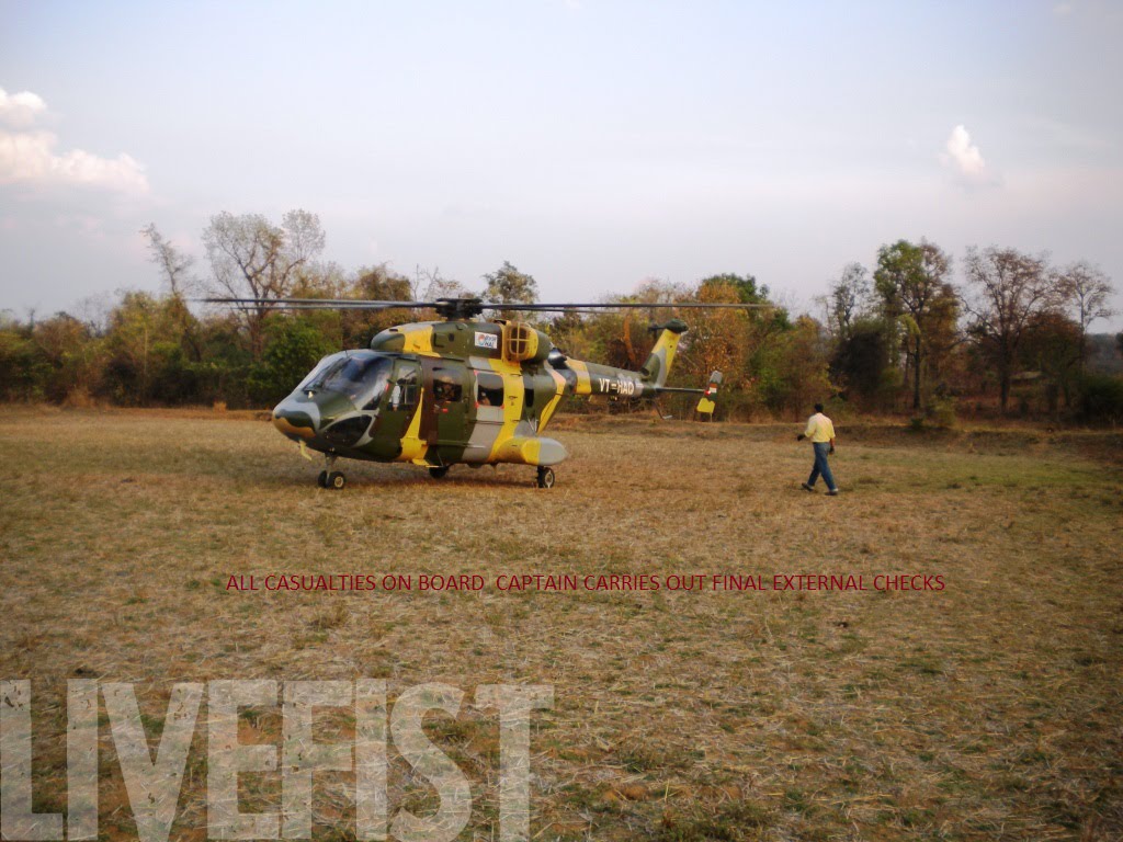After several attempts to identify the TLA yielded no results, Lt Col Tewari further reduced speed and approached the area from the north, and made first visual contact with the CRPF team, who were waving a black cloth. Brig Kanwar also positively identified the CRPF troops. Both men quickly discussed the TLA specifications, its security and approach dynamics. The crew quickly made a tight shorter approach to the TLA and touched down. Lt Col Tewari decided to keep the engines running and quickly take as many casualties as possible. Only two casualties had reached so the pilot decided to leave the CRPF doctor at the TLA to administer first aid to the remaining casualties. As he gunned the Dhruv’s collective for lift-off, he when he noticed hand gestures indicating that one more casualty has made it to the TLA. At about 4.45PM, with three seriously injured troops on board, the Dhruv chopped its way back to Gadchiroli.