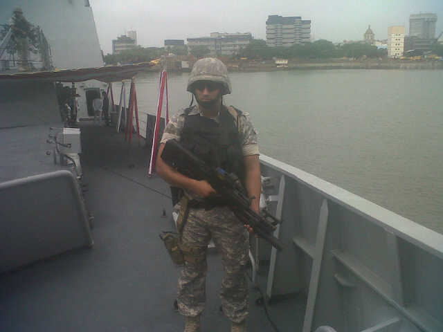 He is not a marine, this was taken on board INS Sahyadri, on its commissioning by Def min Antony. the soldier is a MARCOS commando,in their new gear. they were handling security for the funtion.