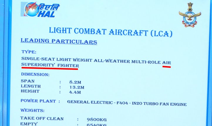 It gets more bizarre. At Monday’s press conference in Bangalore, IAF chief Air Chief Marshal PV Naik said he wished he had a fleet full of air superiority fighters (ASF), but the problem was funds — here he made that unmistakable gesture rubbing his thumb and forefinger together to denote money. But if the acrimony over the Tejas’s generation wasn’t enough, what the Chief probably didn’t know is that HAL has gone ahead and declared the LCA an air superiority fighter. See the placard above, which stood next to one of the static aircraft displays.