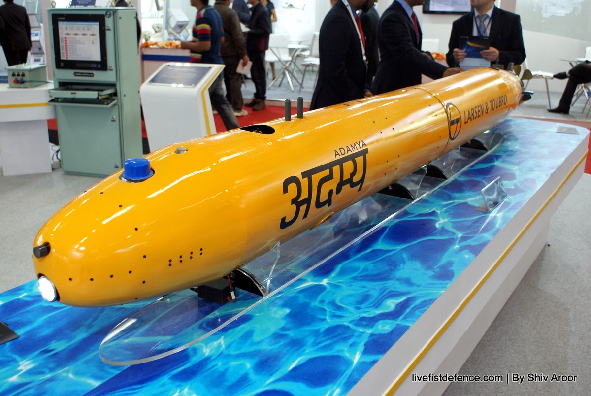 | L&T ‘ADAMYA’ AUTONOMOUS UNDERWATER VEHICLE. DESIGNED & DEVELOPED IN HOUSE BY L&T. DESIGNED FOR DEPLOYMENT FROM TORPEDO TUBE OF SUBMARINES. INDIAN NAVY ‘VERY INTERESTED’. |