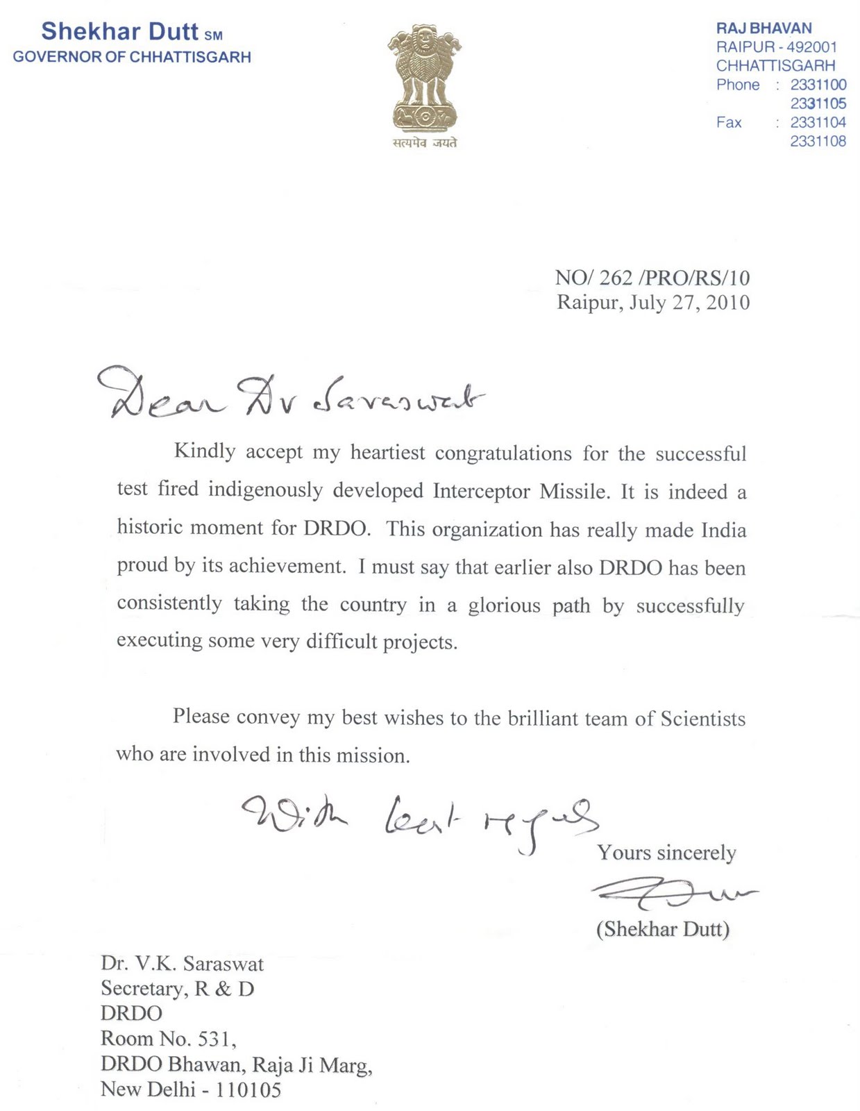 The letter above, from Chattisgarh Governor Shekhar Dutt to DRDO chief VK Saraswat is a lovely illustration of how things change depending on the hat you wear. Governor Dutt was Defence Secretary to the Indian government from July 2005-2007, a time of deep turmoil and very harsh criticism of the DRDO, a campaign that he, as Defence Secretary, made no bones about supporting. A well-respected, straight-talking gentleman, Dutt — a decorated ex-Army officer — was one of the few bureaucrats who unequivocally supported demands for a revamp of the DRDO at the time when there severe opposition and lots of lobbying for a status quo. The P Rama Rao Committee, the bitter pill the DRDO was forced to (and is still being forced to) swallow was Dutt’s brainchild. After a stint as Deputy NSA, Dutt was appointed Governor of Chattisgarh in January this year.