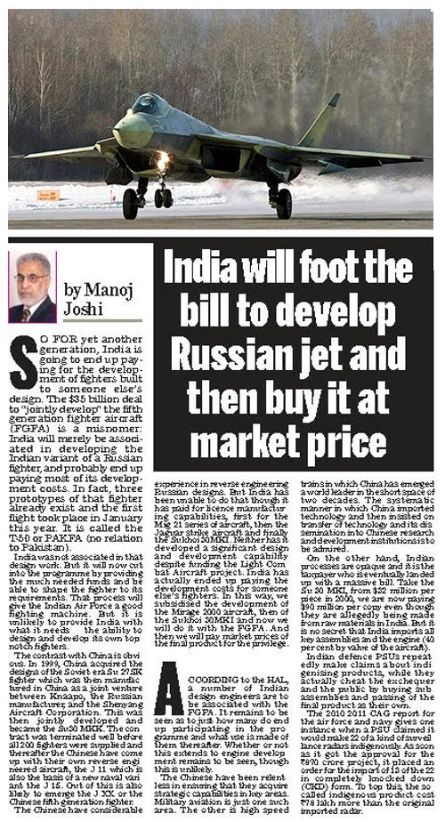 4. What Manoj Joshi said is true why we should pay additional amount for design and make FGFA ,already 3 prototype is developed , what is new design we going to do …us took 4 year to develop the design ….i think we paying good money to russia ….once it sucessfull the they will increase the price of the FGFA like they did it will su30 …MR. JOSHI you r Right
