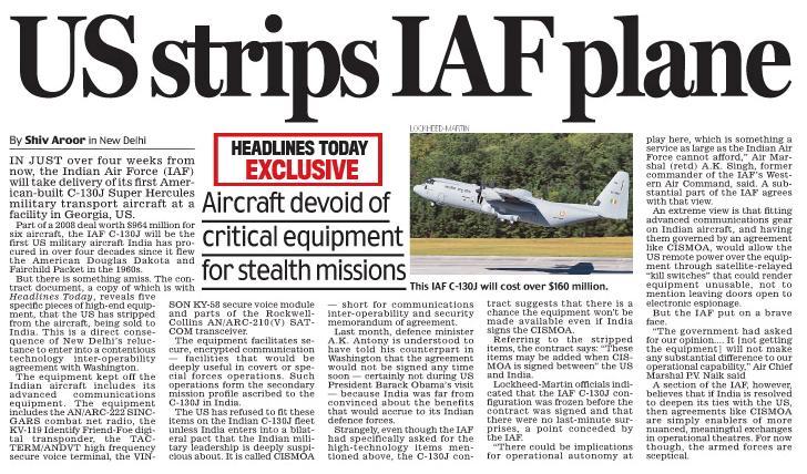 Hey Shiv, why you say "US strips IAF plane" it sounds like US took something away that belonged to us. Why do folks forget that the GOI and MOD were well aware at the on-set that if CISMoA is not signed, some of the high tech components will not be provided. It's not like US forced us to buy these planes. We bought them knowingly that CISMoA was a necessary to receive the the planes as advertised. We had two choices, either we should have rejected these planes, or we should take them as per the agreement… which is no CISMoA, then no "High Tech Gear". The problem is with our Babus who step in thinking that they will get these agreements whithout a political penalty. Then later in the game they realize that the political penalty could be too high, and thus we decided to take the inferior product and blame the US for not providing the technology. It looks as if we are busy thinking in a short-term tactical manner, while forgetting completely about the long-term strategies. We do not have to have an anti-US stance all the time. At least in this case, it's GOI and MOD who should take the blame, US is only living by the terms of the contract. Like I said earlier, if we did not like these terms, we had a choice to say NO. But we did not.